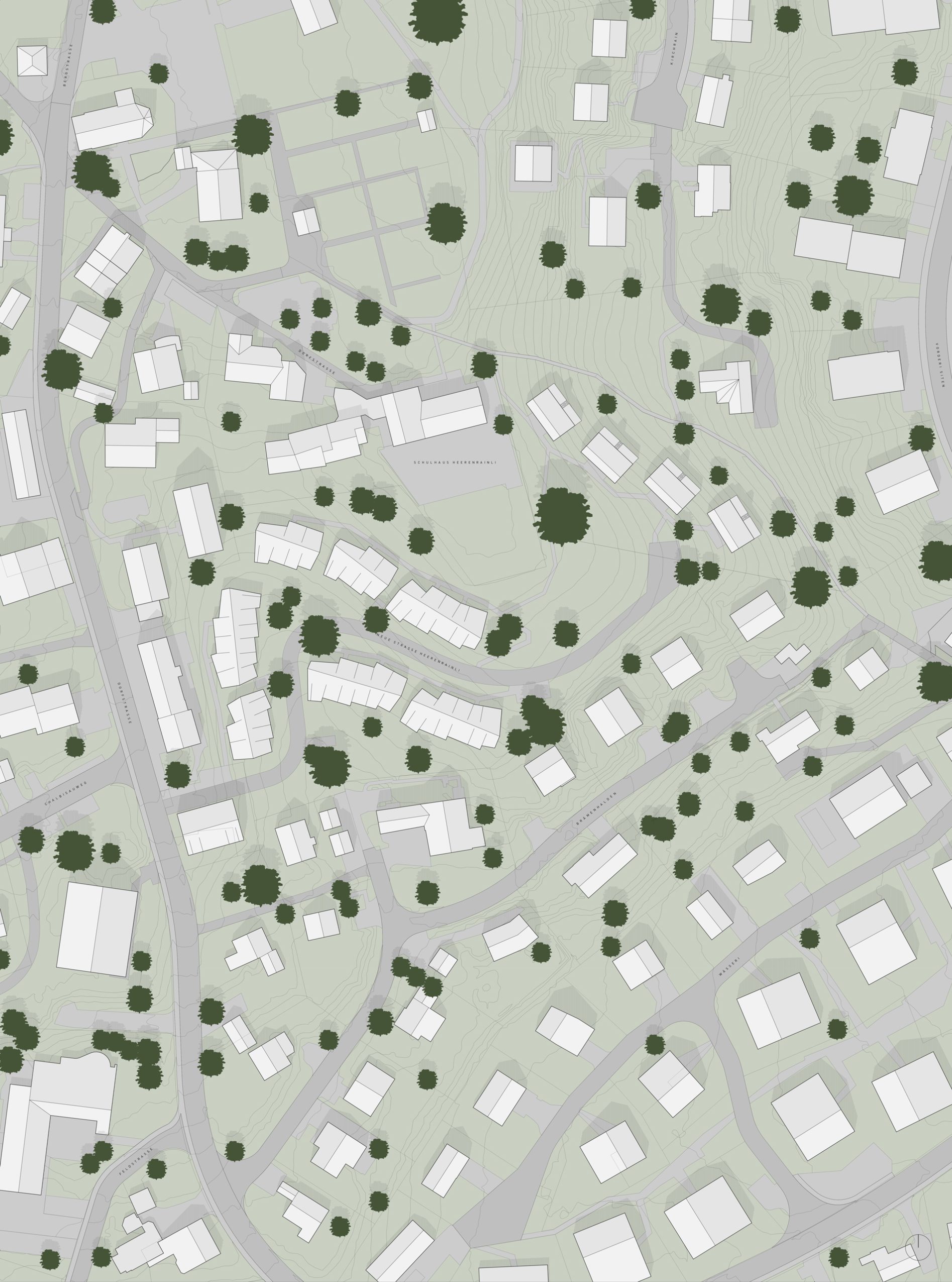 Mit unserem Projekt haben wir die Frage aufgeworfen, ob es andere Formen der Einordnung gibt. Formen, die in Betracht ziehen, dass es sich beim Perimeter um ein grösseres Stück Kulturland und nicht um «Siedlung» handelt. Formen, die auch in Betracht ziehen, dass es sich um ein Stück Land ohne Strassenanstoss handelt, bei dem die Einheit von Haus/Weiler und Strasse/Strassenverzweigung aufgelöst ist. Gibt es einen Ansatz der Einordnung, der einer strukturellen, metaphorischen oder atmosphärischen Logik folgt? Könnte man behaupten, dass das Land weiterhin als ein Stück Kulturland angesehen wird, das lediglich einer neuen Nutzung zugeführt wird? Das heisst, dass Wohnen als neue «Wirtschaftsform» der Landnutzung etabliert würde. Eine solche Form würde sich weniger an der Morphologie als vielmehr einer rationellen Setzung orientieren, wie sie eben agrarische Bewirtschaftung auszeichnet. Im Falle der neuen Nutzung würde sich eine solche «Rationalität» an den Bedingungen des Wohnens anlehnen, wie etwa der Erschliessung, der Belichtung und der Aussicht.