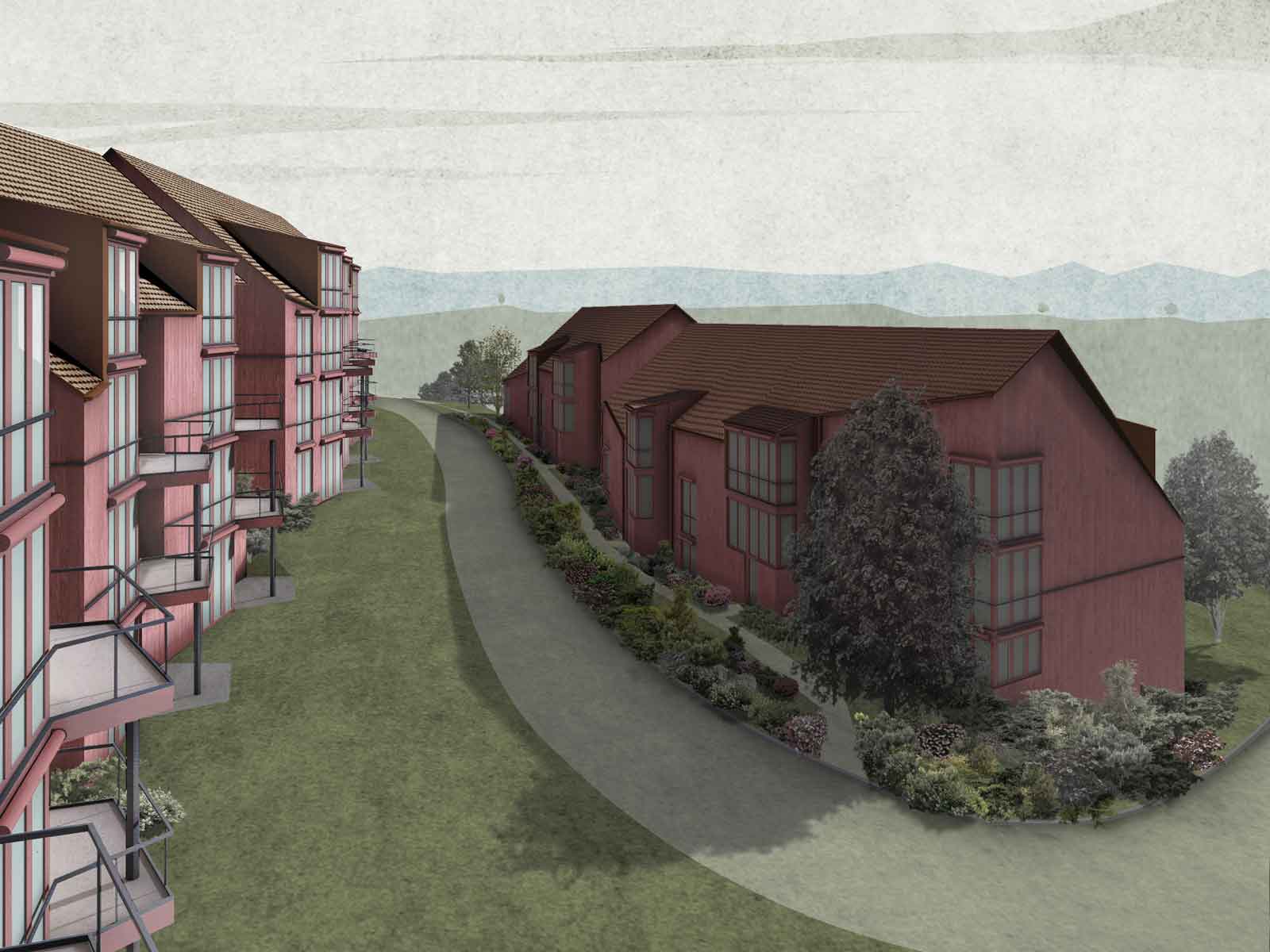 Im westlichen Teil, welcher der Kernzone zugehörig ist, werden drei Reihungen von Häusern vorgeschlagen, welche hangparallel gesetzt sind respektive in ihrer Bewegung je einer Höhenkurve folgen. Sie folgen dem Prinzip einer «terrassierten» Anordnung mit dem Primat der Aussicht und Südausrichtung/-besonnung. Die topografisch bedingt freie und «weiche» Anordnung der Baukörper ordnet sich gut in die angrenzende Kernzone ein. Die Gebäudelängen und -höhen sowie die Firstrichtung werden mehrheitlich eingehalten. Auch diese Häuser sind mit Holz verkleidet. Damit werden die Bauten zu den strassenständigen, muralen Altbauten der Kernzone abgesetzt. Die Farbigkeit, welche sich am traditionellen Ochsenblut anlehnt, zeichnet sie gleichzeitig als nobilitierte Wohnbauten aus. Die Fassadenkonstruktion mit einer vertikalen, farbigen und gehobelten Holzschalung, aussen liegenden Fenster und dem feinen «Netz» der Absturzsicherungen schafft eine «papierene» Gebäudehaut, welche die Bauten «leicht» und elegant erscheinen lässt.