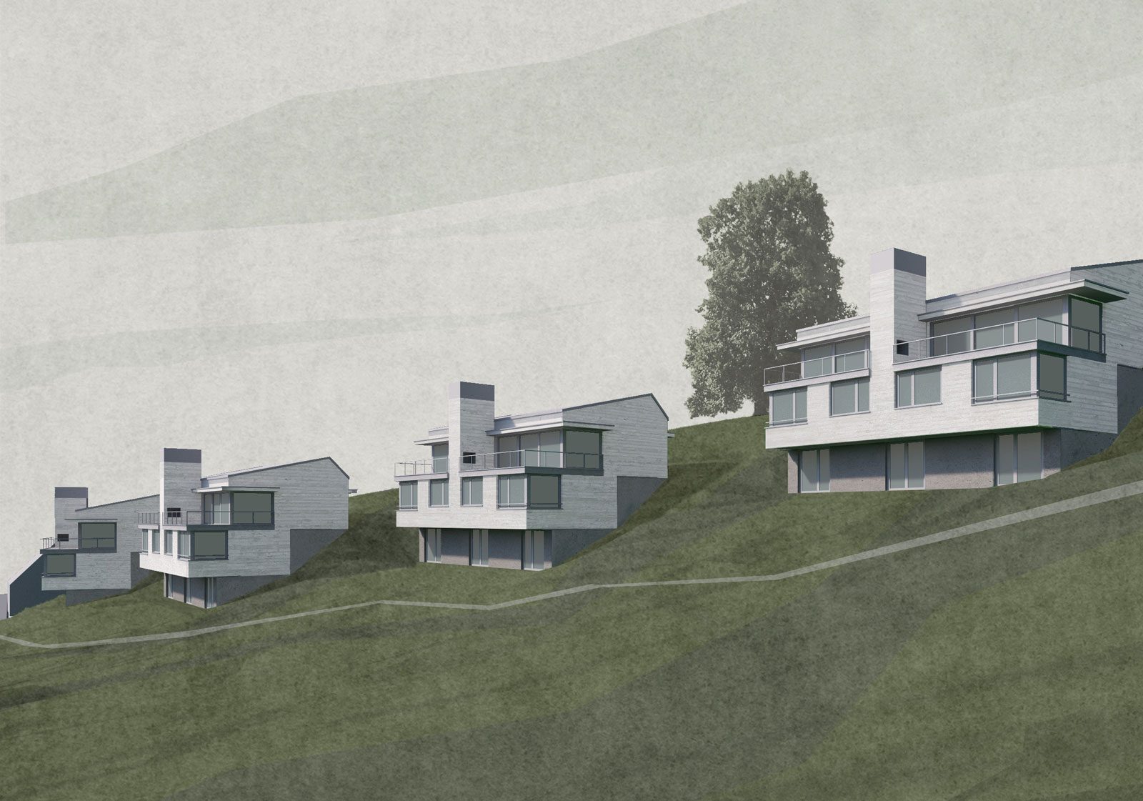 Das ortsbauliche Konzept ist vor dem Hintergrund dieser Überlegungen zu erklären. Vorgeschlagen werden drei typologisch unterschiedliche Bebauungsformen. Im Osten sind das vier flache und kompakte Doppelhäuser, die hangparallel als kleine Solitäre in den Wieshang gesetzt sind. Das asymmetrisch ausgebildete, flach geneigte Dach folgt der Hangneigung. Es handelt sich um Doppeleinfamilienhäuser mit je einer 4- und einer 5-Zimmer-Hauseinheit. Architektonisch besitzen die Häuser mit dem Haus Schlehstud in Meilen von Hans Fischli (1933) eine unmittelbare Referenz. Das Haus Schlehstud besitzt in unseren Augen eine Architektur, die entschieden der Moderne verpflichtet ist, über die Materialisierung in Holz und die Farbigkeit sowie Ausbildung des Daches aber gleichzeitig sehr effektiv mit dem ländlichen Kontext des Zürichseebeckens vermittelt.