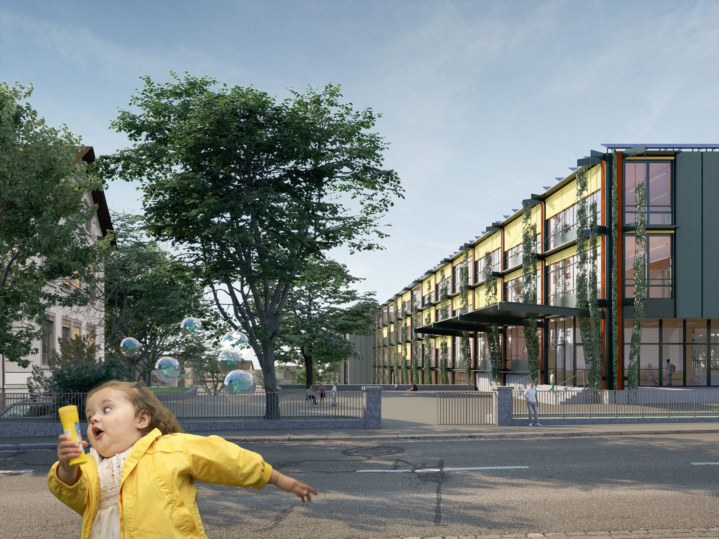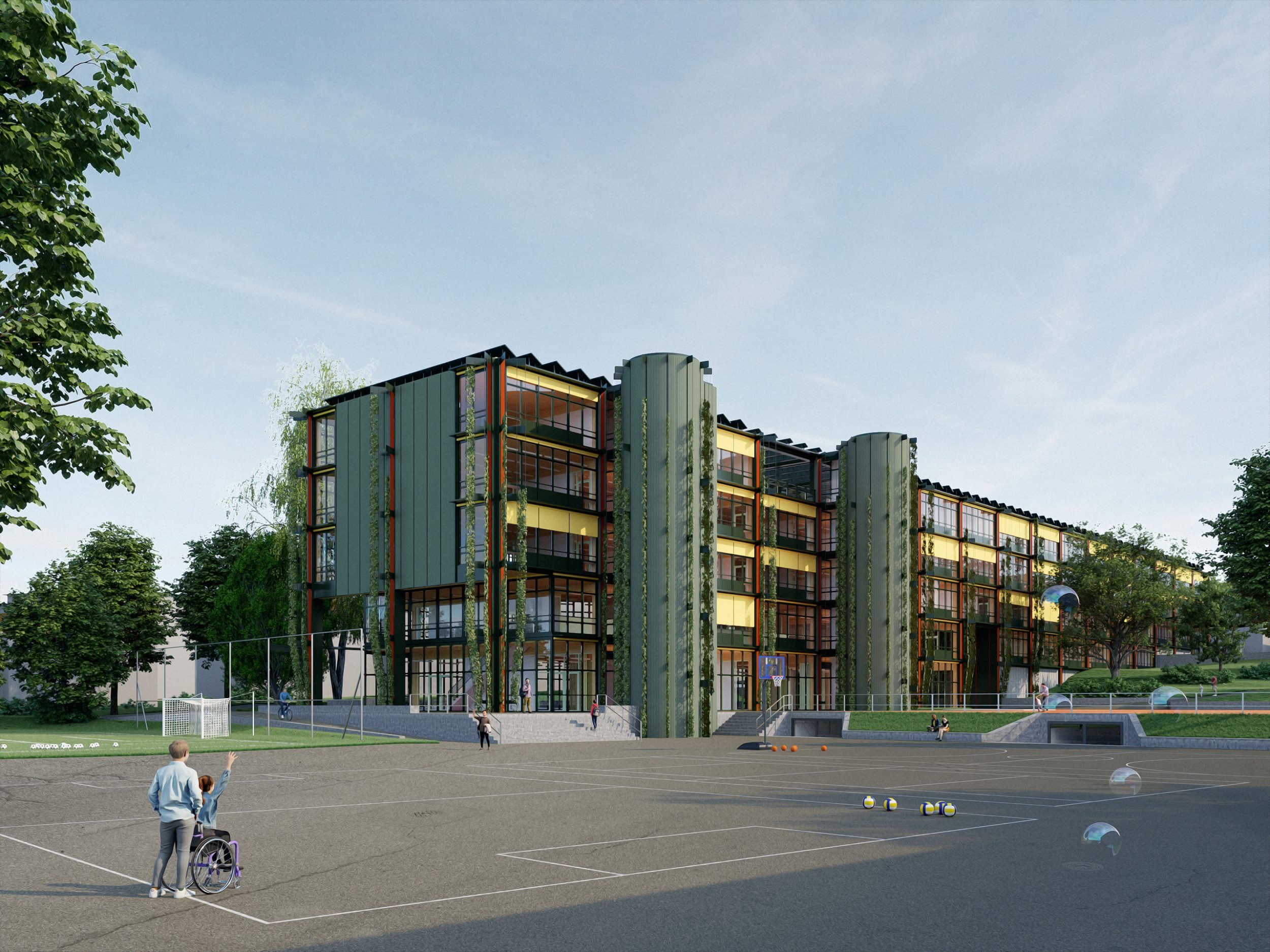 In seiner Konzeption als Skelettbau in Holz mit nutzungsoffenen, adaptiven Grundrissen, einer architektonisch thematisierten Fassadenbegrünung, einer eigenen Energieproduktion mit Photovoltaik sowie dem Erhalt der grossen Baumgruppen ist das Projekt konsequent einer ökologischen, ökonomischen und sozialen Nachhaltigkeit verpflichtet.