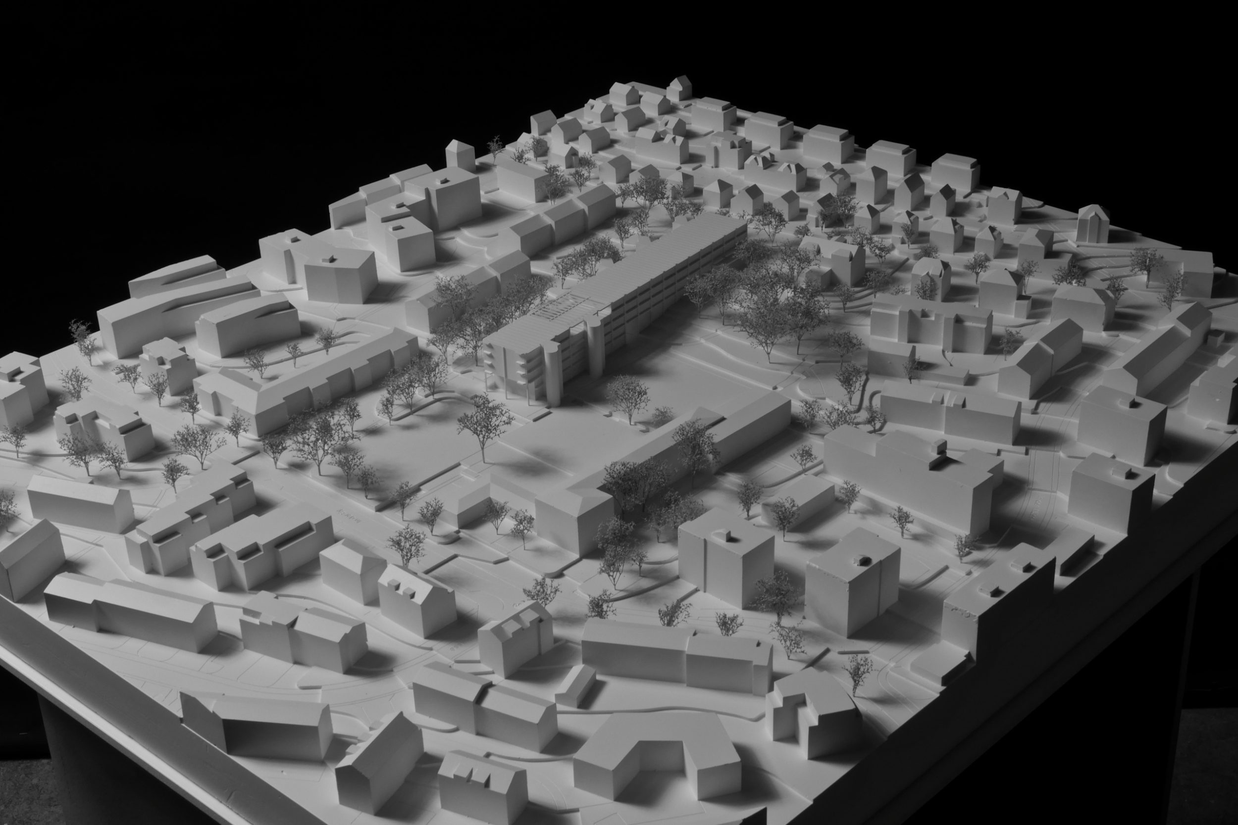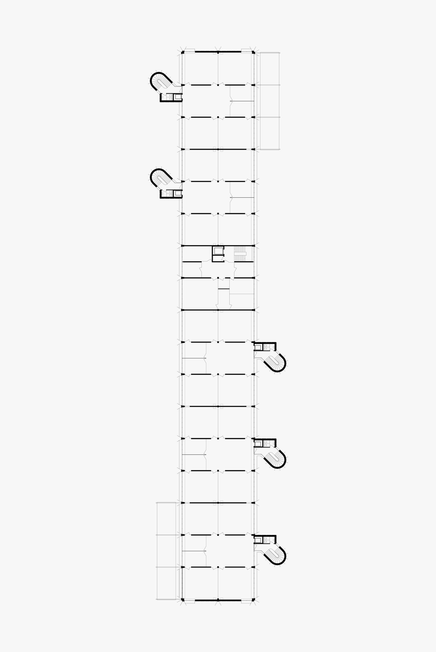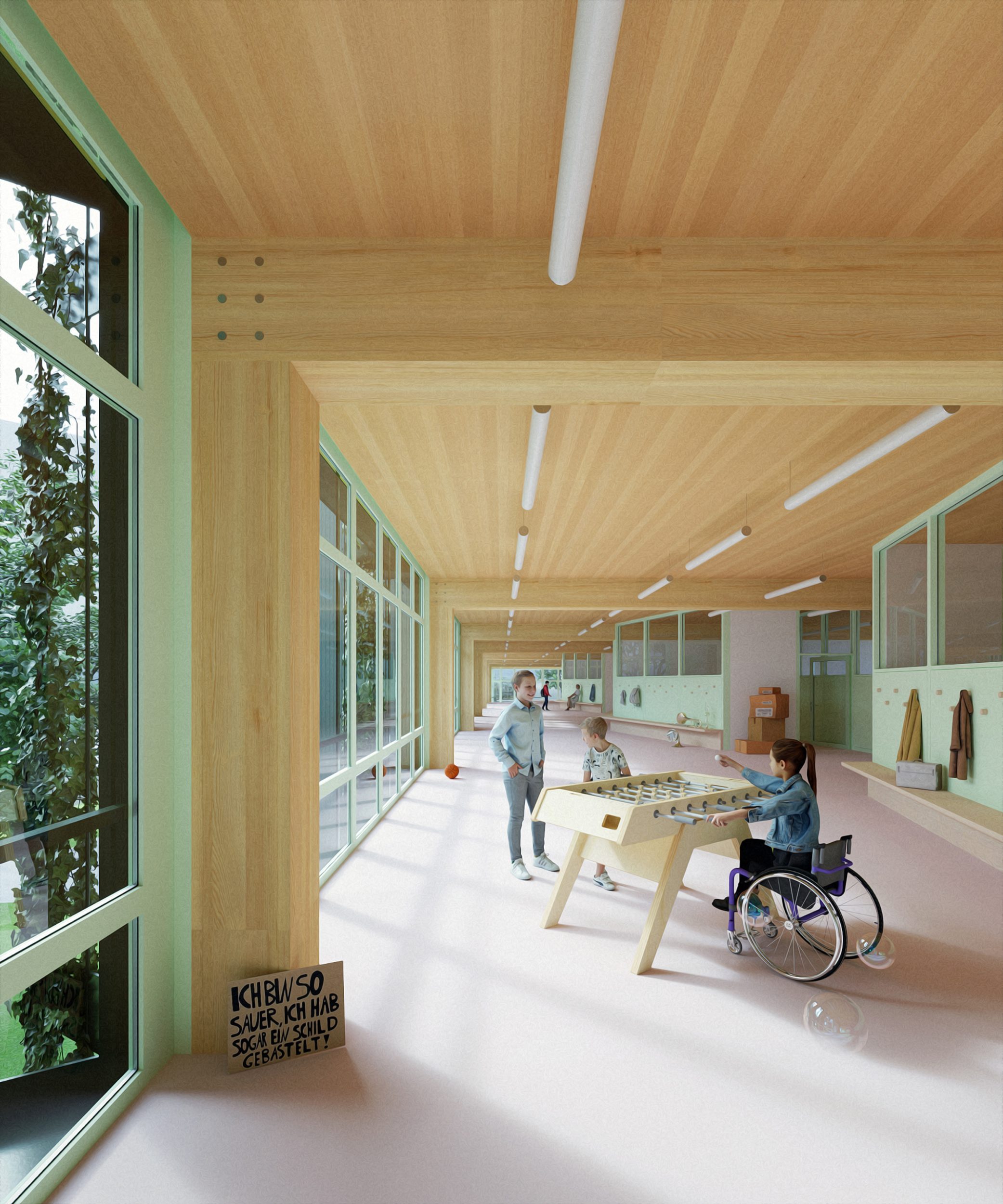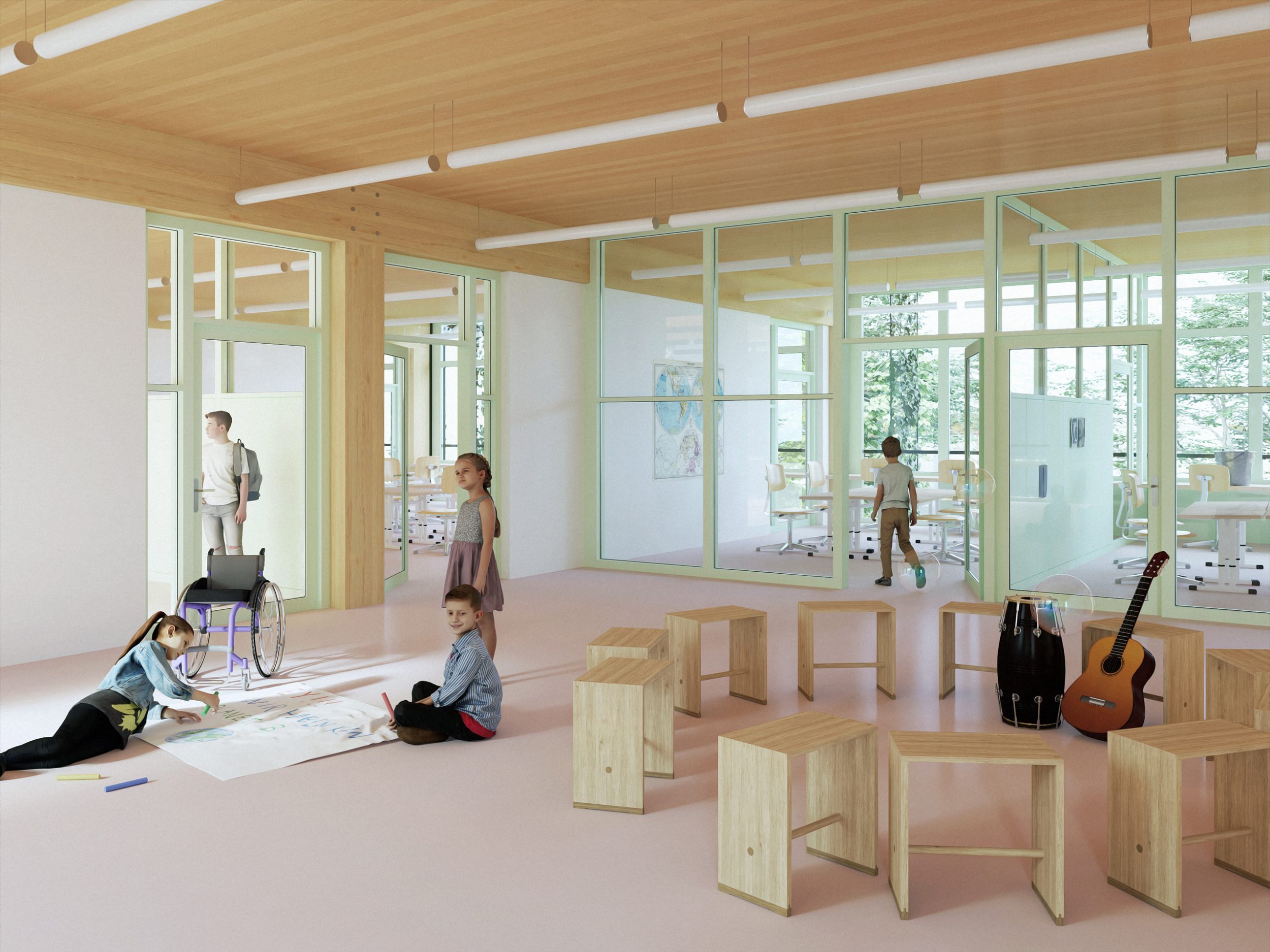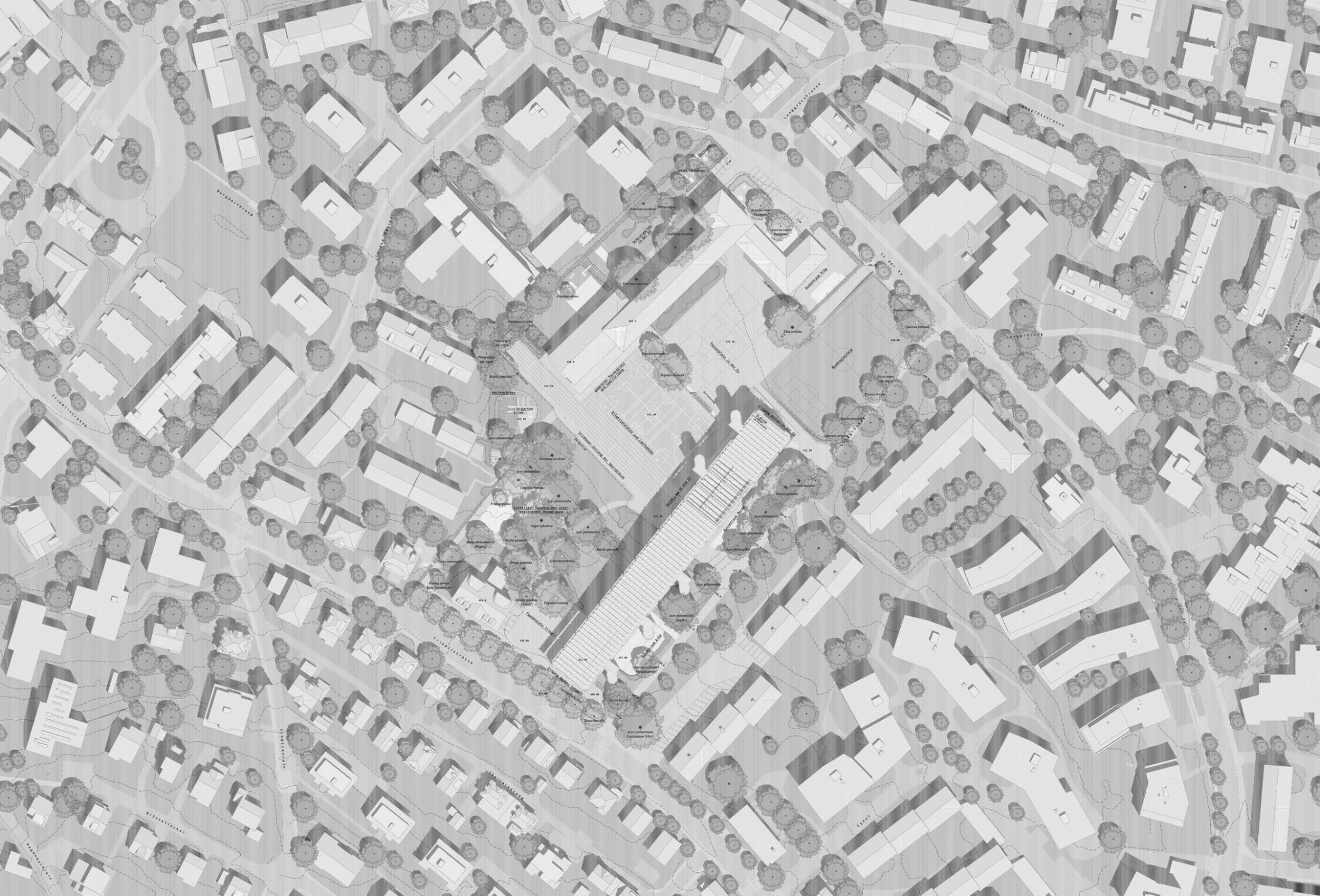Das Projekt verfolgt in dieser Situation drei Absichten. Erstens wird mit einem grossen neuen Schulhaus ein Baukörper entworfen, der sich auf den Massstab des grossräumigen Grünraumes bezieht und über seinen kleinen Fussabdruck die Offenheit, den Zusammenhang und die Durchlässigkeit des Freiraumes auf dem Areal stärkt. Zweitens wird mit der Grösse des Schulhauses ein öffentliches Gebäude geschaffen, das sich im Massstab von der angrenzenden Wohnbebauung absetzt und die Kraft aufweist, einen neuen Ort im städtebaulichen Gefüge von Albisrieden zu formulieren. Und drittens gibt das Projekt mit einem Baukörper eine Antwort auf die sich stetig wandelnden Bedürfnisse der Schulen und der Schulraumplanung, indem das Gebäude als «offenes und grosses Regal» maximale Flexibilität für zukünftige Veränderungen und Adaptionen bietet – die Schulen Triemli und In der Ey nisten sich in dieser Struktur als «Schulhäuser im Schulhaus» ein.