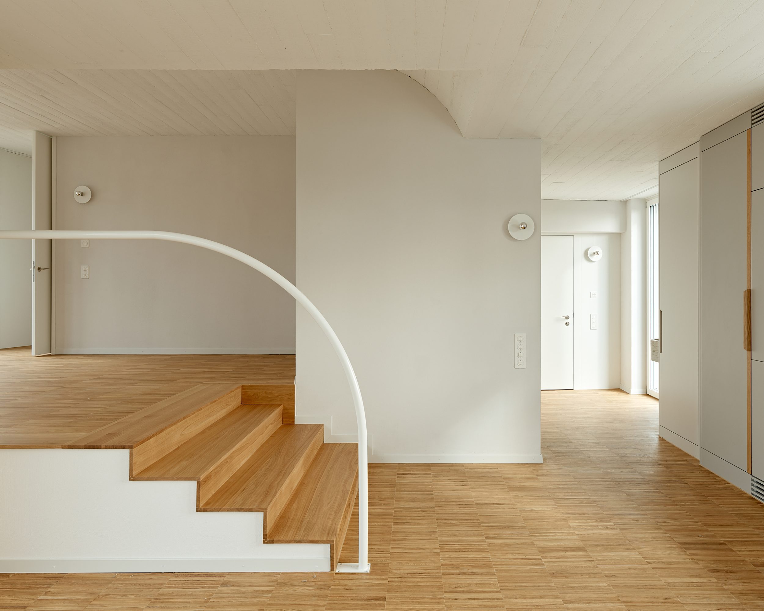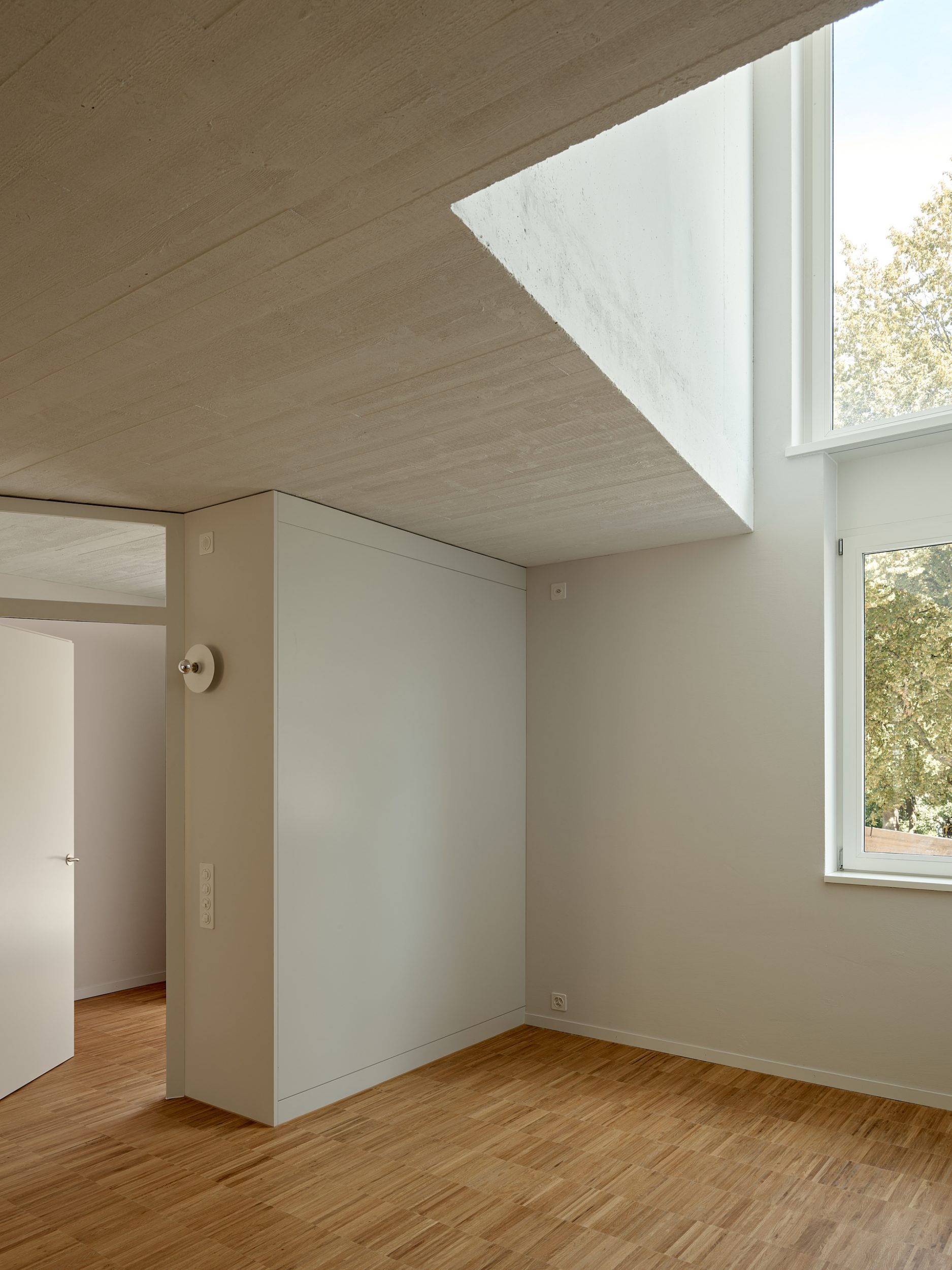 Die Topografie zieht sich gewissermassen durch das ganze Haus. Die starke Hanglage und die bergseitige Westorientierung bestimmen den bisweilen archaisch anmutenden Innenraum. Ein Stufenschnitt bringt das Licht in die Tiefe und schafft auf jedem Geschoss andere Wohnungen. Dabei entsteht eine Räumlichkeit, welche in der Bewegung erfahren wird.