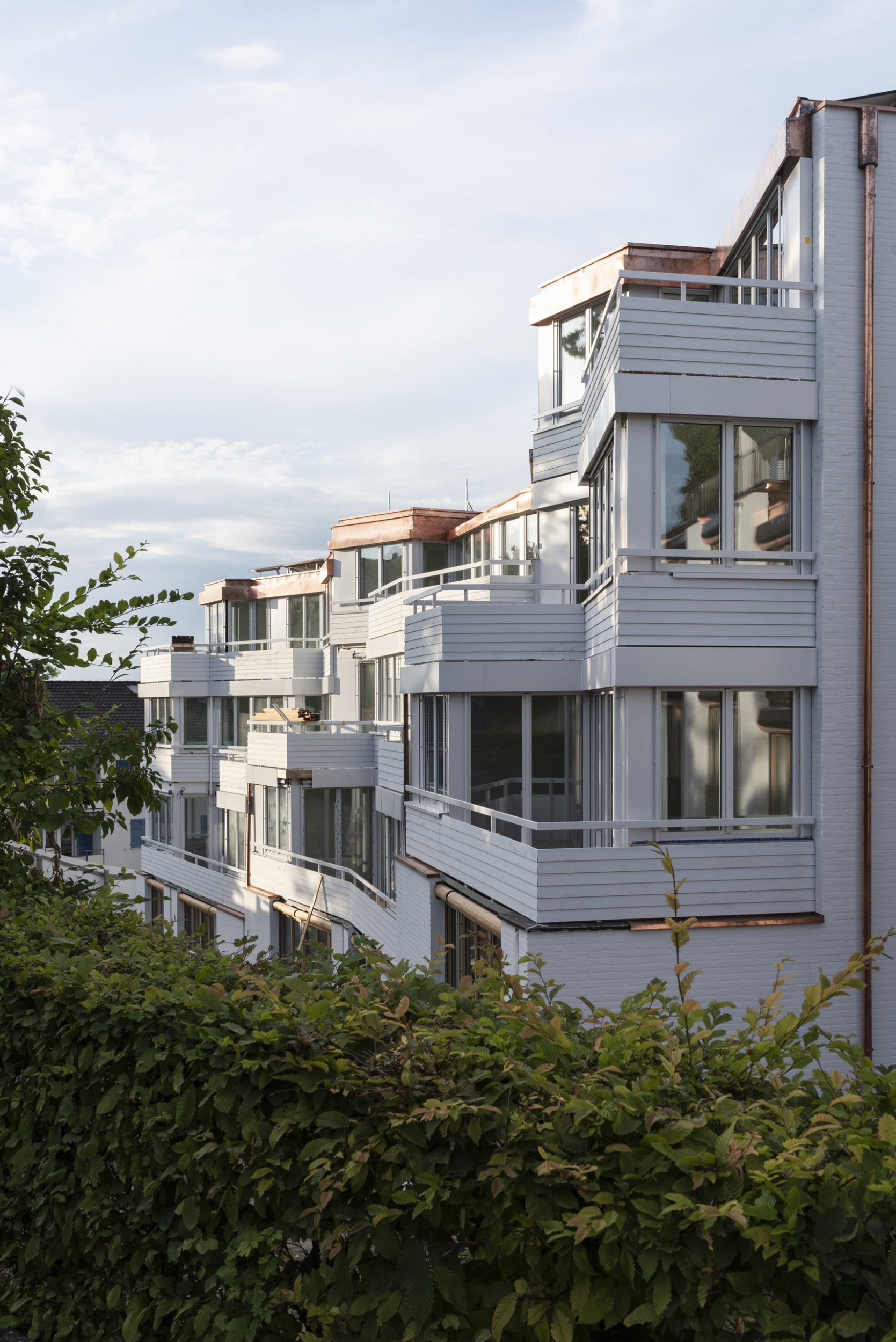 Das neue Wohnhaus liegt am Nordhang des Hönggerbergs in einer Kurve der Schauenbergstrasse. Es ist Teil eines beschaulichen Quartiers mit Einfamilienhäusern, einfachen Zeilenbauten der Nachkriegszeit sowie grösseren Ensembles der Spätmoderne weiter bergwärts. Aufgrund der starken diagonalen Neigung des Grundstücks findet das Haus seinen Schwerpunkt über eine differenzierte, plastische Gestalt. Diese Plastizität wie auch der formale Ausdruck sind eigenständig. Wir haben von einer nordischen Fantasie gesprochen. Mit dem Bezug zu nordeuropäischen Ideen besteht dann doch eine lockere, inhaltliche Beziehung zum Quartier.